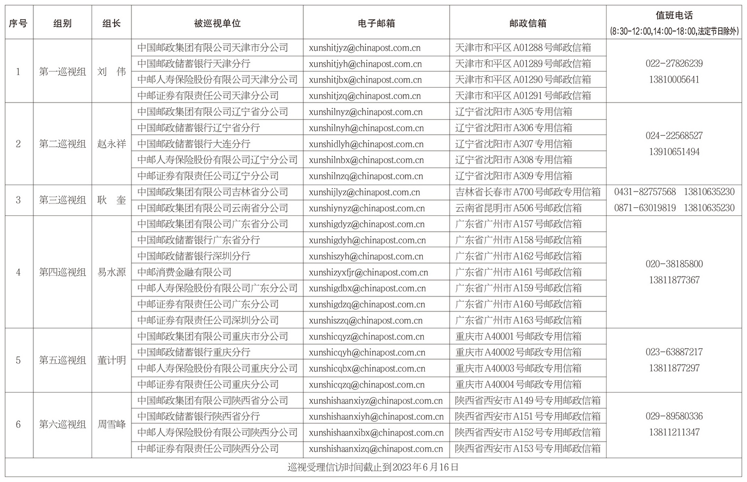 根据集团公司党组部署,党组巡视组将在被巡视单位开展为期两个月左右的巡视。巡视期间设立专门值班电话和专用邮政信箱,主要受理涉及反映被巡视党组织领导班子及其成员、下一级党组织领导班子主要负责人和重要岗位领导干部问题的来信来电来访,重点是关于违反政治纪律、组织纪律、廉洁纪律、群众纪律、工作纪律和生活纪律等方面的举报和反映。巡视受理信访时间截止到2023年6月16日。