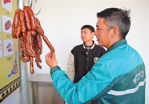 在直播间,牦牛肉肠很受欢迎,直播前哈弄夺机都要仔细查看货源品质。□张晋通 摄