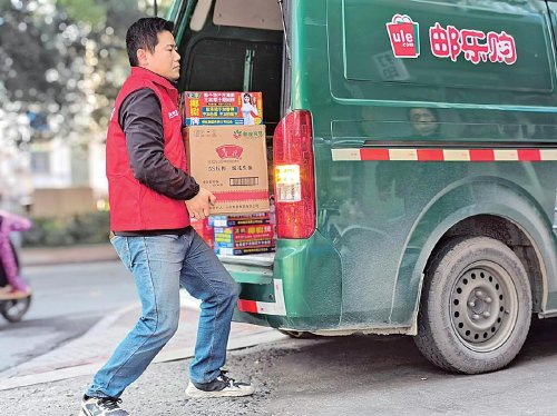 浙江省绍兴市邮政分公司专职地推人员孙明在配送“年货节”产品。 □郑思薇 摄