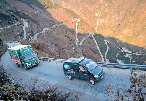 从四川省甘孜藏族自治州康定市出发,沿着318国道向西行驶30多公里就到达大渡河边。从河谷沿着一条崎岖山路上行,此时,导航软件传来急促的提醒:“前方连续急转弯,请小心驾驶!”抬头一看,眼前的盘山邮路如一条挥舞的丝带,曲折回环,不禁让人胆寒。