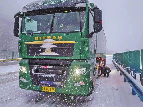 陕西省西安邮区中心驾驶人员给邮车加装防滑链,带上方便面、牛奶等应急食品及保暖被袋,冒着大雪和低温出班,将邮件安全送达目的地。□王仪 徐策 摄影报道
