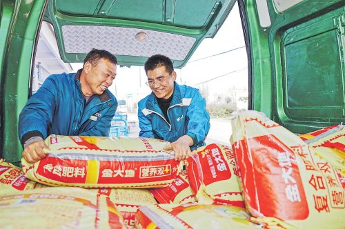 河南省驻马店市遂平县邮政分公司农资配送员李华伟(右)和揽投员李勇一起,赶往阳丰镇黑赵村综合便民服务站,送去该村村民订购的复合肥。店主张行夸奖道:“邮政服务好,配送及时,农肥质量有保证。” □中国邮政报记者 贾红伟 通讯员 李平 殷明珠 摄影报道