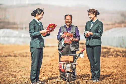 山东省淄博市沂源县邮政分公司员工深入田间地头,来到大张庄镇董家河沟村,为村民介绍邮政助力春耕的服务内容。 □中国邮政报通讯员 王禾 周鹏 记者 袁威 摄影报道