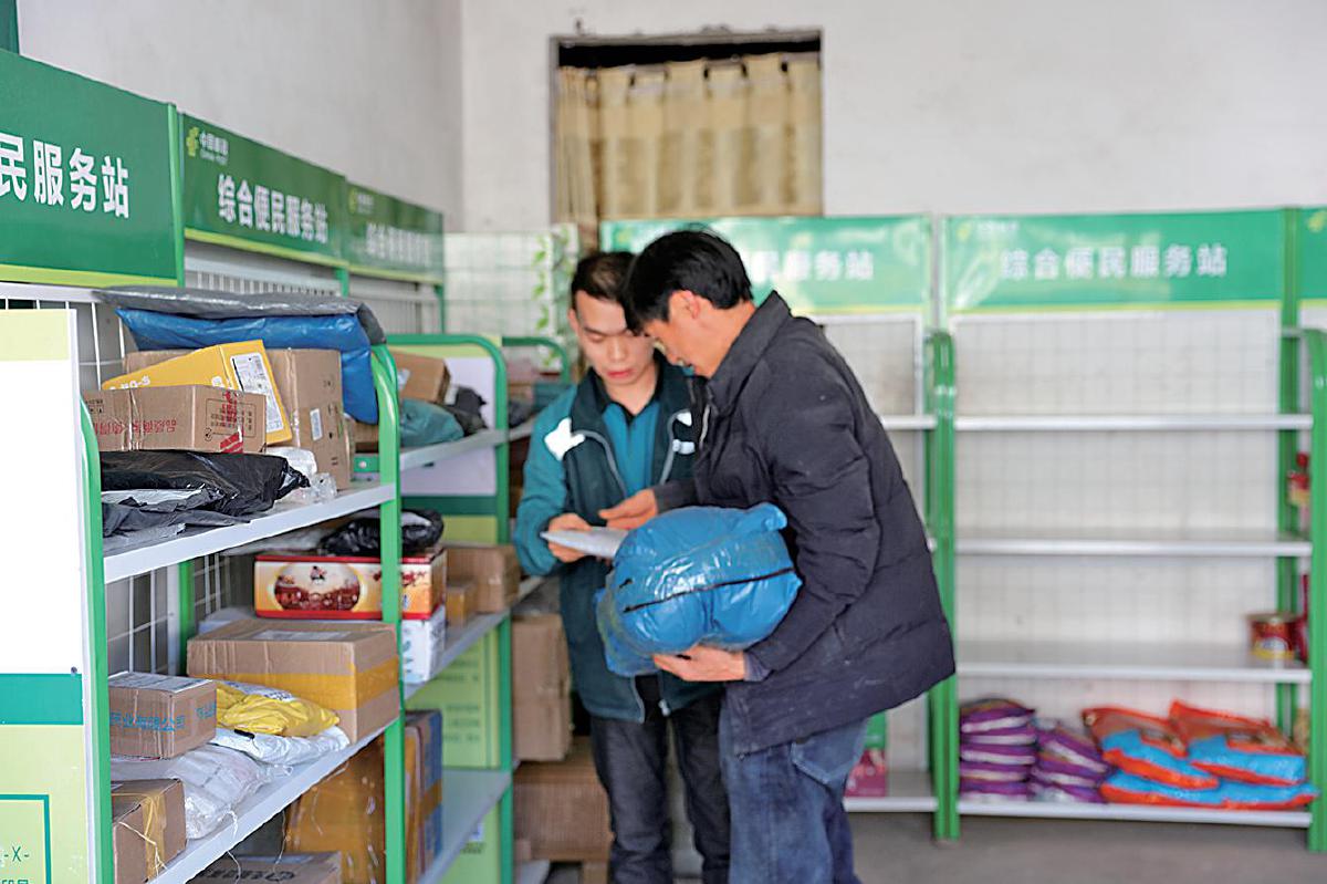客户在西安村邮政综合便民服务站取件。 □李宏鑫 摄