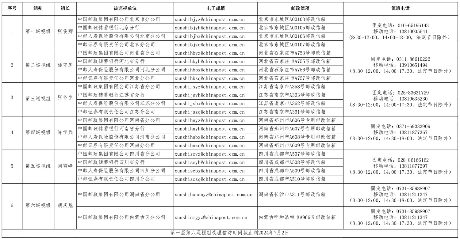 根据集团公司党组工作部署,截至5月7日,党组2024年第一批巡视完成进驻工作。6个巡视组对5省(市)20家邮政企业单位开展常规巡视,对2家省(区)邮政分公司开展专项巡视。