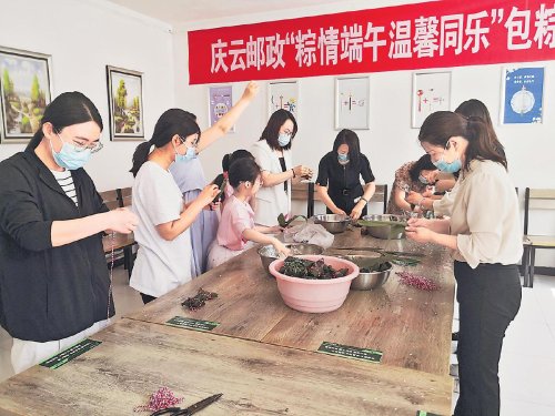 每年端午,德州市庆云县邮政分公司都会邀请客户到“职工小家”开展包粽子活动。 □李平 摄