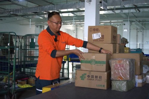 工人边取件边说:“只要我们把地址写成邮件寄存点,邮车就能给我们送过来,我们又能愉快地买买买了。”