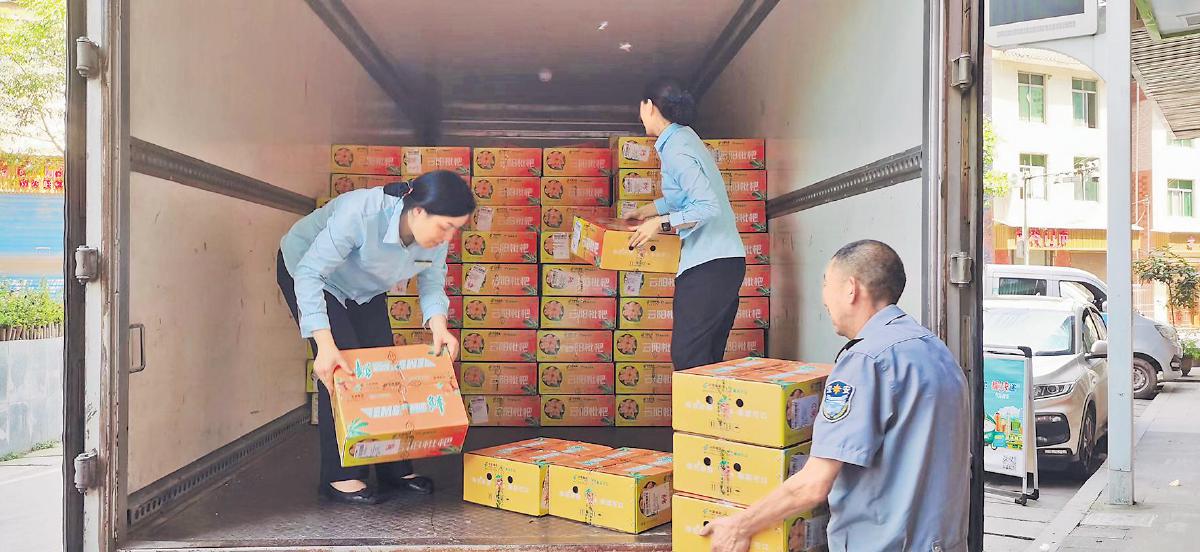收寄高峰期,巴阳邮政所全员出动,把装好箱的枇杷邮件搬上邮车。□谭鹏程 摄