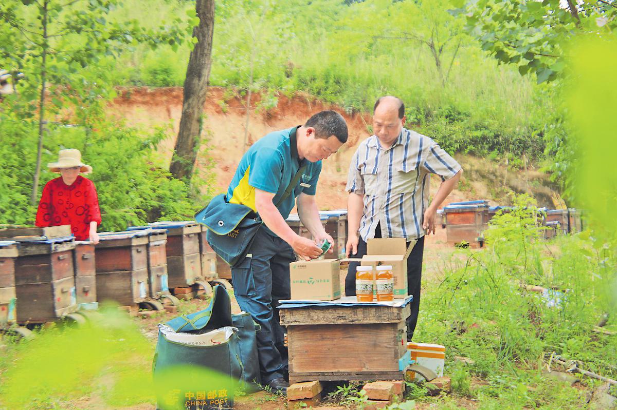 邮政员工走进深山,上门为寇军红收寄蜂蜜。