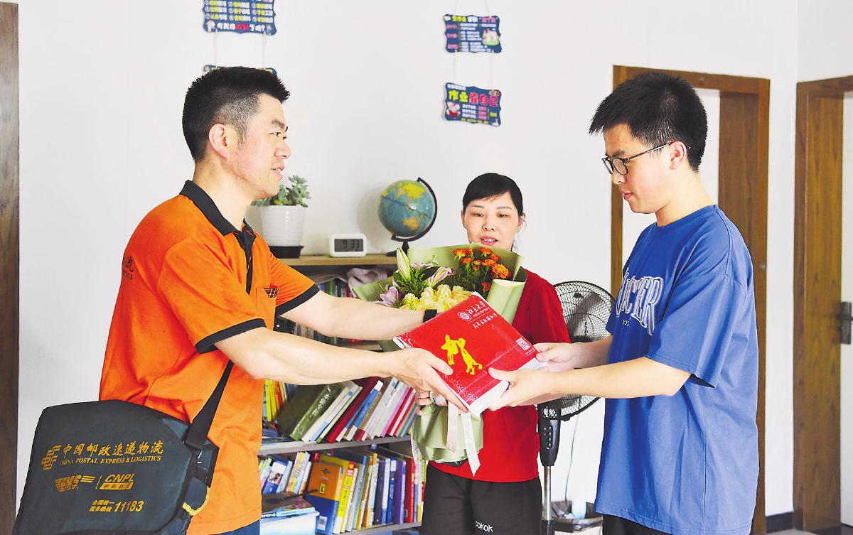 7月21日上午,浙江省永嘉县邮政分公司员工王小蒙为儿子王传祈送上北京大学录取通知书。收到父亲送来的录取通知书,王传祈很激动,感谢父亲以辛勤的工作为自己树立了榜样,表示上大学后要继续努力学习,以优异的成绩回报父母。王小蒙参加邮政工作已有16年,送了很多件高考录取通知书,这是他最幸福、最特殊的一次投递。他希望儿子今后用所学的知识为国家贡献自己的一份力量。