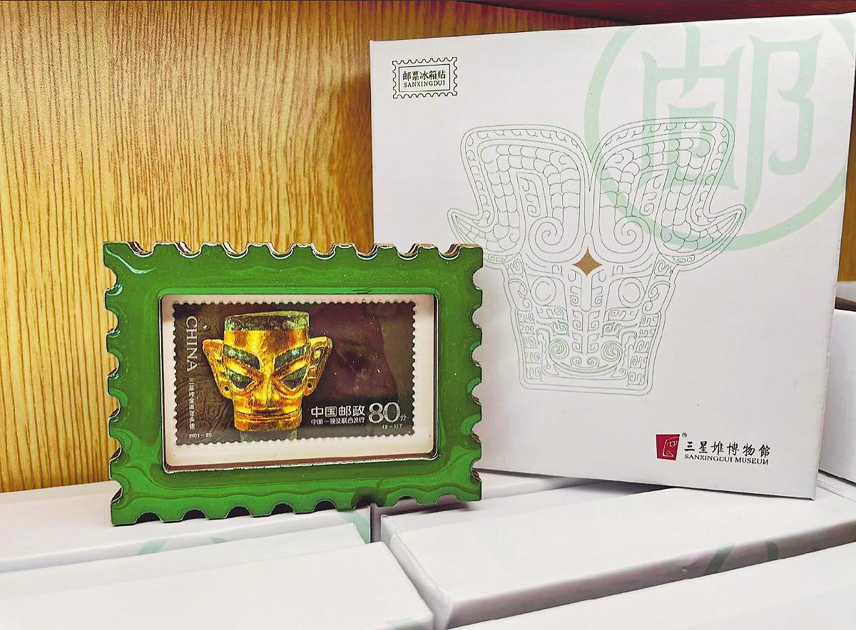 三星堆邮票冰箱贴选用了三套三星堆元素的邮票,与邮政元素相结合,边框采用邮政绿色加邮票齿孔的设计,整体采用双层木料加滴胶工艺使冰箱贴牢固耐用,精美的包装也使其更易于收藏。