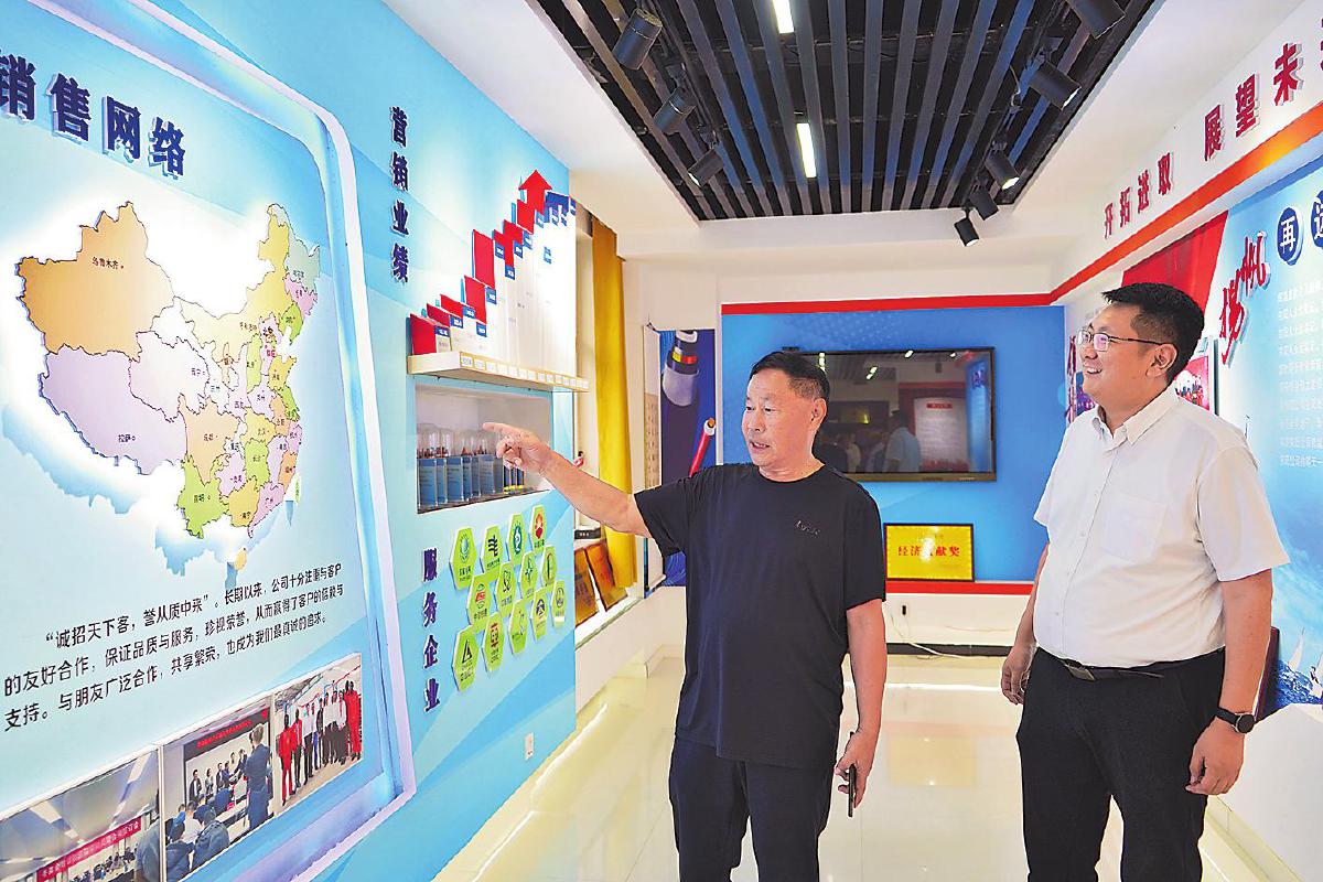 牛玉祥(左)与苏伯寅回顾京阳立津线缆有限公司发展历程。