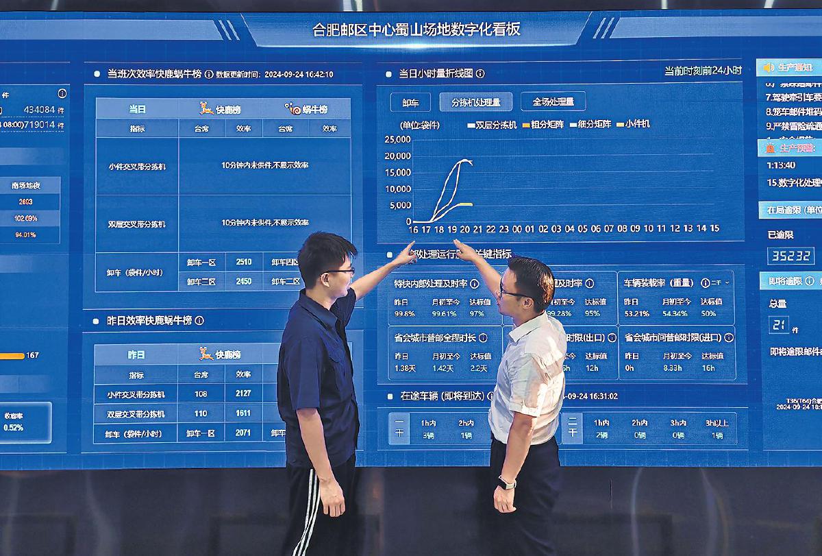 “效率倒逼法”是来自合肥邮区中心的又一创新。他们基于信息技术开展数据分析与建模,借助数字技术和自行研发设计的批量辅助程序进行数据收集、分析、预测和评估工作,对现场设备运行、人员排班、车辆发运、场地资源、能源评估、开机计划、设备故障等进行量化分析,积极开展均衡生产作业,平均作业时长压缩3小时。同时,组建跨部门的大数据项目组和数字化处理中心应用专班,为外包管理开展各类数据分析、数据支撑、数据赋能及技术支撑工作。