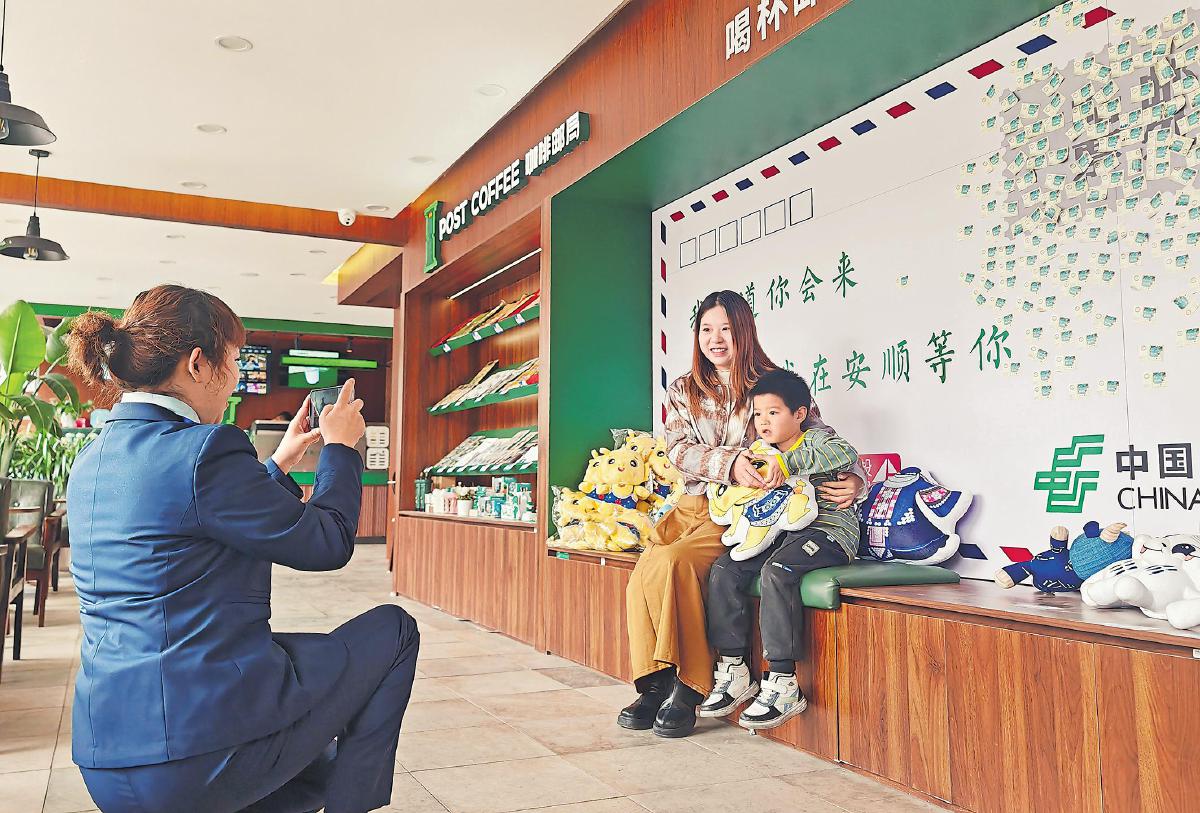 伴随贵州省安顺市打造城市旅游品牌的步伐,安顺市邮政分公司深入推进文旅融合,与安顺旅游集团文创商品发展有限公司携手打造“邮局咖啡·遇见安旅店”。店内装修兼具邮政特色、古城风格与现代风情,设有文创展示、邮局文化、网红打卡、印章加盖及DIY明信片等区域,为游客提供独特文化体验,成为安顺古城旅游的新地标。图为11月8日,邮政工作人员在为游客打卡拍照。