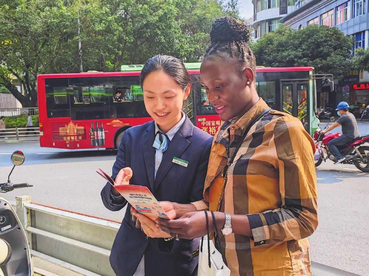 邮储银行福建省南平市分行工作人员在网点周边向外籍客户宣传“零钱包”。□肖维珍摄