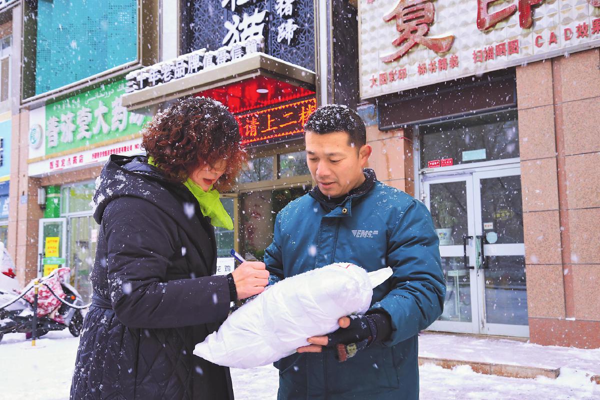 近日,新疆维吾尔自治区巴音郭楞蒙古自治州迎来了入冬后的第一场大雪。受暴雪极端天气影响,气温骤降且道路湿滑难行,给快递运输、投递都带来较大阻碍。为了让客户尽早收到快递,巴州邮政分公司揽投员顶着纷飞的雪花,迎着刺骨的寒风,比平时更早出班投递。他们送件的手是冰凉的,但是送出的快件温暖着每一位客户。“下这么大雪还以为你们会晚点送呢,没想到这么快就收到了。”客户张女士对邮政服务称赞不已。