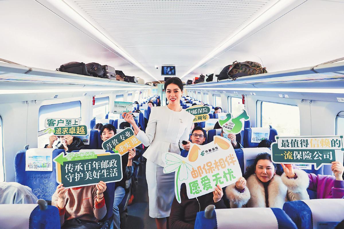 12月20日,中邮保险在江苏南京南站举办了高铁冠名专列首发仪式,并在冠名的高铁品牌列车上开展了“情满江苏 服务万家”金融消保知识问答活动。活动中,中邮保险特邀主持人向乘客介绍了中邮保险的综合实力与优质服务,中邮保险工作人员围绕金融消费者权益保护,与乘客进行了趣味有奖问答互动,并邀请乘客扫描二维码,关注中邮保险微信公众号,观看《大国保险》普惠促进城乡融合暨中邮保险专题片。此次活动为乘客们增添了旅途的乐趣,也进一步传播了中邮保险“邮保相伴 愿爱无忧”的品牌主张。