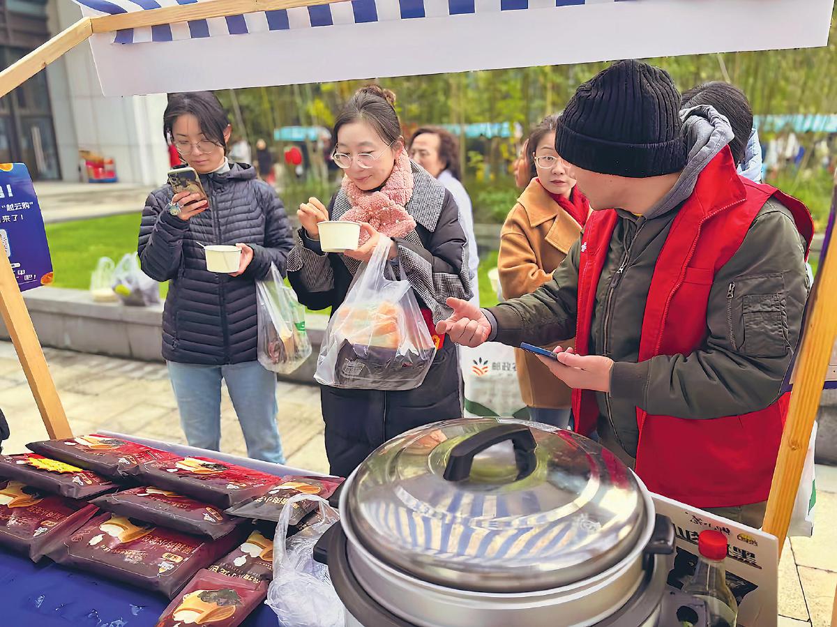 邮政员工现场品尝小笼包、上网接龙订购。