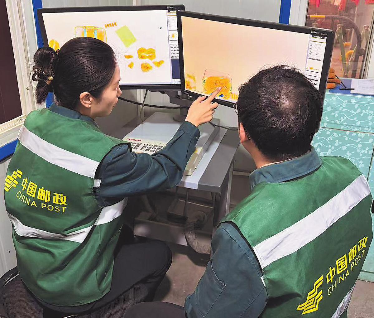 图为济南邮政工作人员对进京邮件进行二次过机安检。