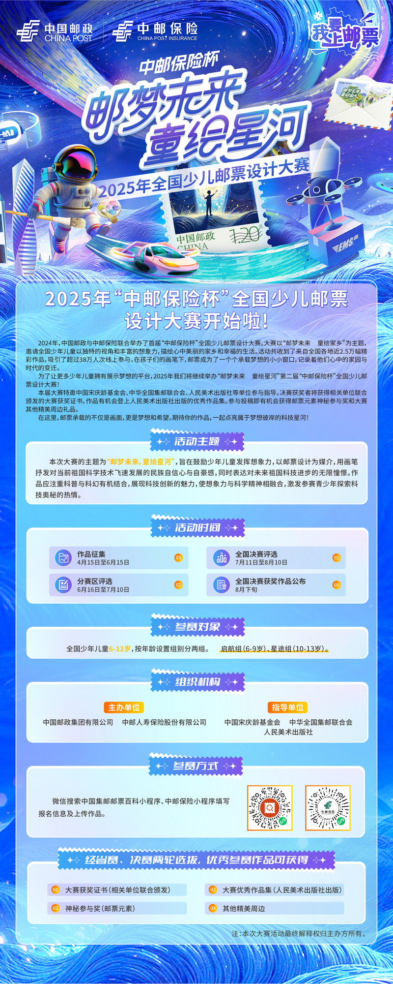 本次大赛的主题为“邮梦未来,童绘星河”,旨在鼓励少年儿童发挥想象力,以邮票设计为媒介,用画笔抒发对当前祖国科学技术飞速发展的民族自信心与自豪感,同时表达对未来祖国科技进步的无限憧憬。作品应注重科普与科幻有机结合,展现科技创新的魅力,使想象力与科学精神相融合,激发参赛青少年探索科技奥秘的热情。