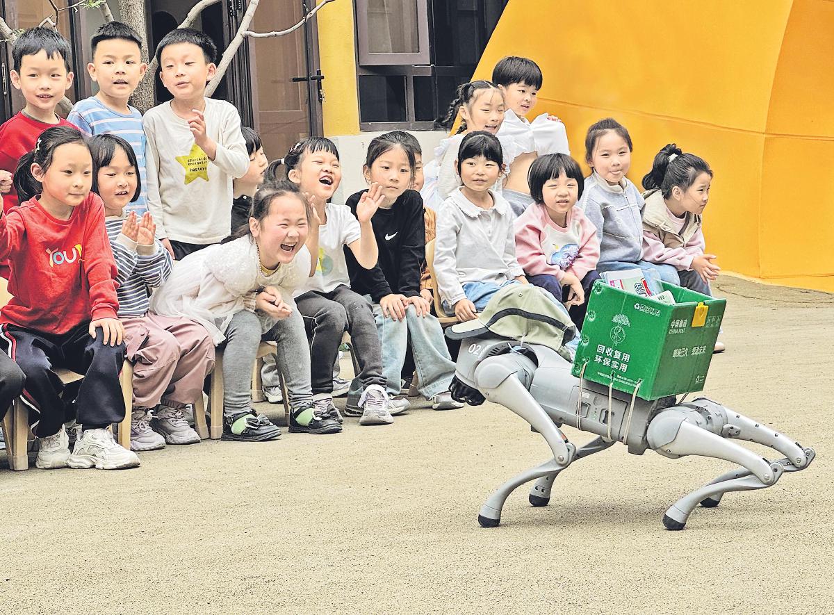 小朋友通过“小小邮递员”“小小银行家”等角色扮演,与机器狗互动,体验送报、送信、送快递,学习认识钱币等知识。现场还设立了集邮文创产品、幼儿画报图书展示区,吸引了众多师生前来打卡。图为“邮小驿”机器狗一出场就获得小朋友喝彩。