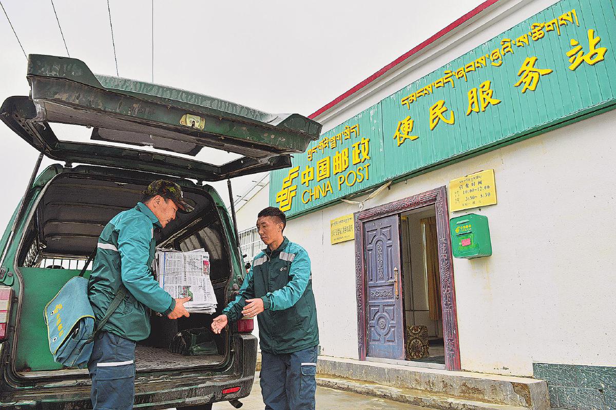 西藏邮政将党报党刊投送至全国海拔最高的乡——普玛江塘乡。□藏由 摄