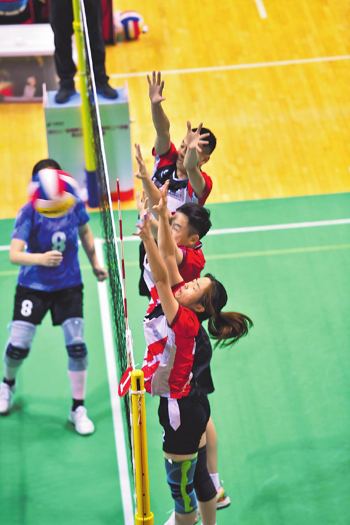 虽然扣球来势汹汹,但绝不让它轻易穿透我们的防守。