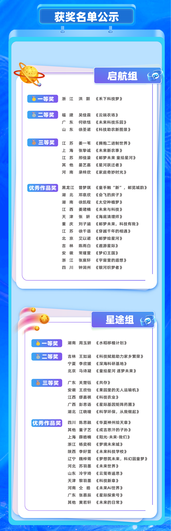大赛开始以来,得到了社会各界的广泛关注与参与,全国23个赛区共收到8.5万幅参赛作品,从中推选出230幅优秀作品参与全国总决赛的评比。经过激烈的角逐和专家评委们的严格评审,评审出了“一等奖”2件、“二等奖”6件、“三等奖”10件、“优秀作品奖”24件,共计42件获奖作品。来自全国各地的参赛小艺术家们手执画笔,在方寸邮票上精心描绘未来科技世界的奇妙图景,充满想象力的作品不仅获得各位评审专家的高度赞誉,更成为展现新时代少儿科学素养与创新活力的亮丽窗口。
