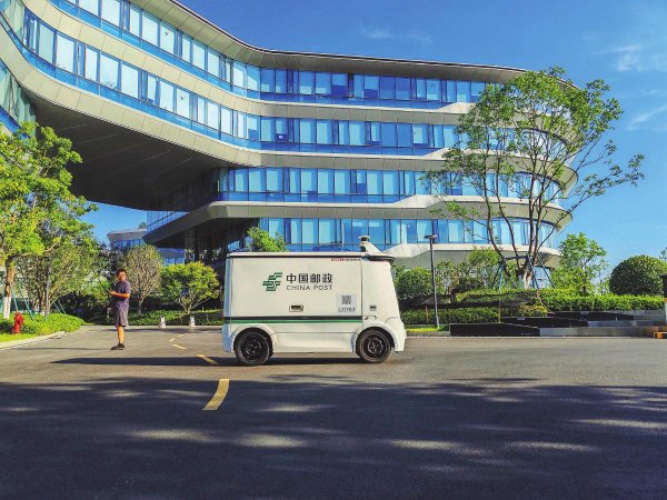 8月20日,在安徽省合肥市科大讯飞小镇,邮政无人车在配送邮件。