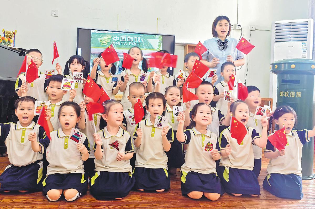 “十一”国庆节即将到来之际,为将爱国主义的种子深植心田,让民族自豪感蓬勃生长,江苏省南通市海门区邮政分公司联合该区通源幼儿园开展“邮趣庆华诞”主题活动,通过辨识邮政业务、学做邮帽、手绘邮票和明信片等形式,让孩子们体验丰富多彩的邮政文化,共同迎接中华人民共和国成立76周年。图为该幼儿园小朋友手举国旗和手绘的邮票图案,齐声祝福伟大祖国生日快乐。