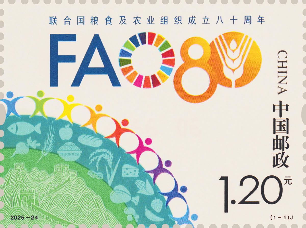 中国邮政于10月16日发行《联合国粮食及农业组织成立八十周年》纪念邮票1套1枚,邮票图案名称为:联合国粮食及农业组织成立八十周年。