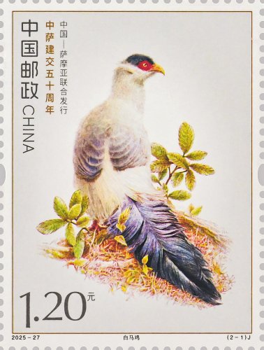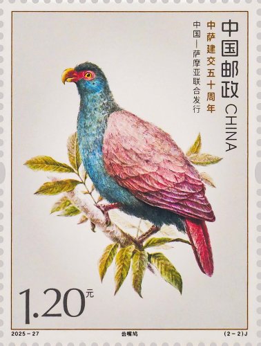 本套邮票以两国的特色鸟类为核心设计元素,融西方钢笔线条与东方淡彩的表现技法,笔触细腻传神,形象生动逼真,两只禽鸟顾盼相应、神气贯连,洋溢着蓬勃的生命力。本套邮票既展现两国独特的自然生态之美,更传递出两国友谊的深厚底蕴与美好未来。第一枚邮票表现了白马鸡。作为四川丹巴莫斯卡鸟类重要栖息地的主要保护物种,白马鸡也成为丹巴自然生态的鲜活代表,当地独特的高原气候、适宜的生态环境为其提供了理想生存空间。第二枚邮票表现了齿嘴鸠。作为萨摩亚的本土特有鸟类,齿嘴鸠不仅是当地生态系统的重要成员,更被视为萨摩亚自然与文化遗产的象征,承载着萨摩亚人民对家乡土地的热爱与珍视。