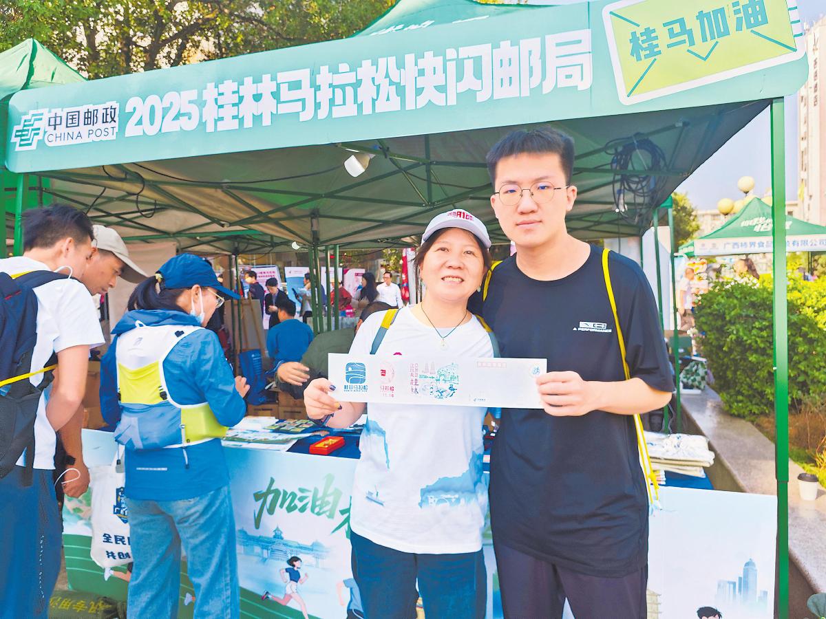 “快闪邮局”不仅提供个性化明信片打印、纪念邮戳加盖等服务,还推出马拉松连片明信片、嵌入实物邮票的冰箱贴与手机支架等文创产品,吸引众多选手驻足体验。参赛选手王先生说:“我在比赛现场就集到本次马拉松的2枚定制纪念邮戳和11枚桂林风景章,非常开心,使我这次马拉松之旅更加难忘。”许多跑友还通过明信片打印服务实时记录参赛精彩瞬间,并现场寄递分享。