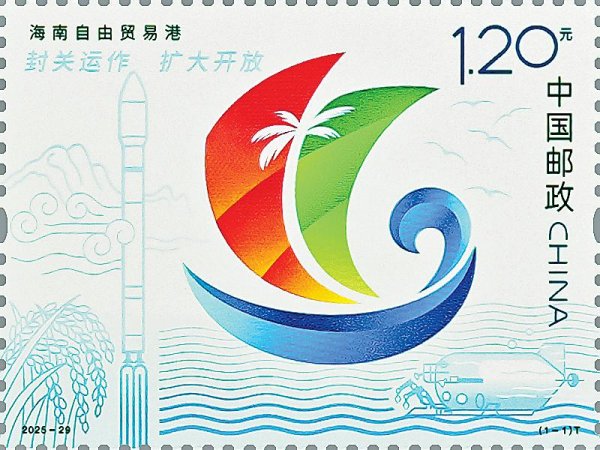 12月18日,海南自由贸易港将正式启动全岛封关运作。这一重大举措,标志着中国对外开放进入全新阶段,对于加快吸引全球优质要素集聚、促进海南自贸港高质量发展具有重要意义。邮票画面以海南自由贸易港形象标识为主体,左上角表现了“封关运作 扩大开放”宣传语;画面背景绘有五指山、稻穗、火箭、深海勇士号载人潜水器、数据传输(无色荧光)等元素,展现出“五向图强”高质量发展新图景,寓意海南自贸港向着加快建设具有世界影响力的中国特色自由贸易港目标奋勇前进。