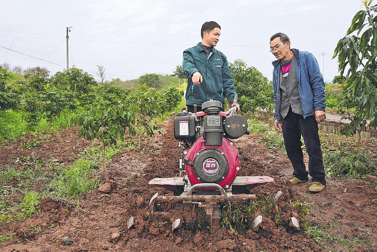3月12日,江津区邮政分公司工作人员在油溪镇大坡村为村民讲解耕地机操作,以科技赋能春耕生产。 □王春兰 摄