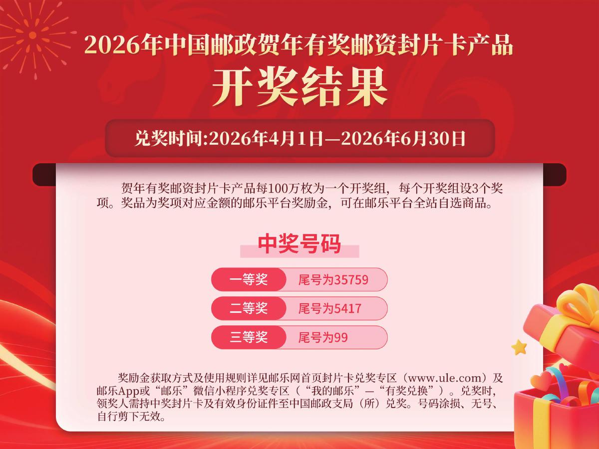 2026年中国邮政贺年有奖邮资封片卡产品开奖结果