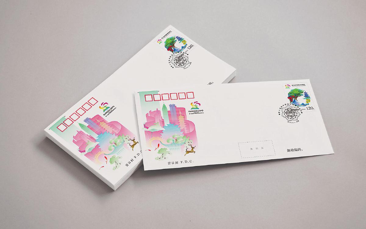 色彩与工艺延续清新雅致的基调,以青绿和粉红为背景色,建筑群施以多彩的颜色,山茶花邮戳则起到画龙点睛之效。整体设计力求在方寸之间传递“诗画山海·共享绿色生活”的园博主题,兼具纪念性与艺术收藏价值。