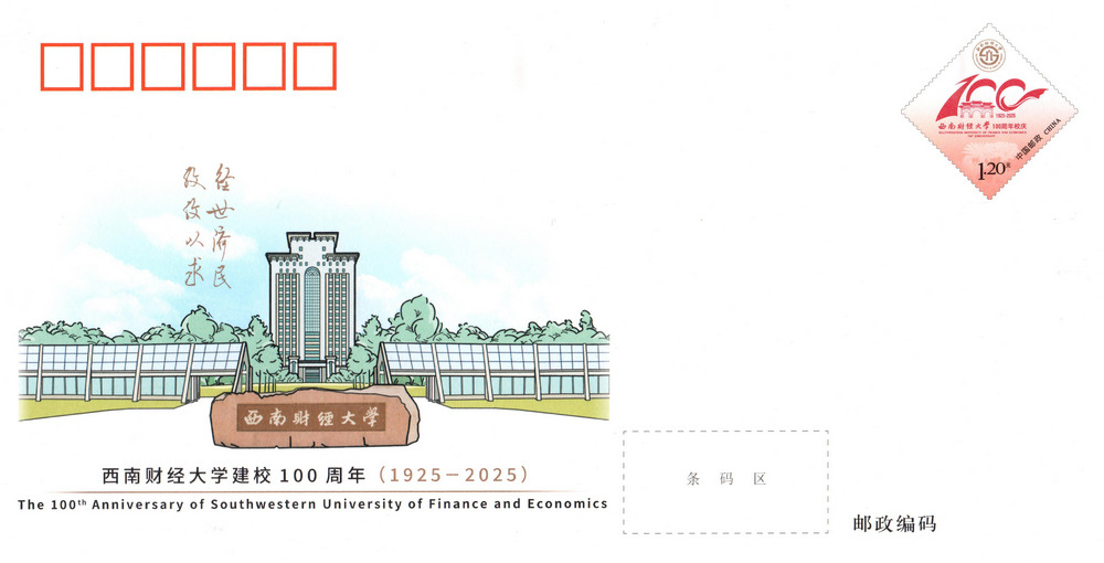 中国邮政定于2025年6月3日发行《西南财经大学建校100周年》纪念邮资信封1套1枚。详情如下: