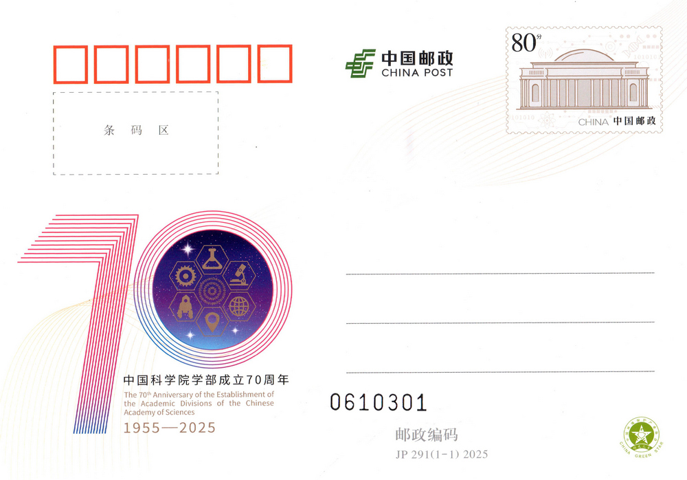 中国邮政定于2025年6月1日发行《中国科学院学部成立70周年》纪念邮资明信片1套1枚。详情如下: