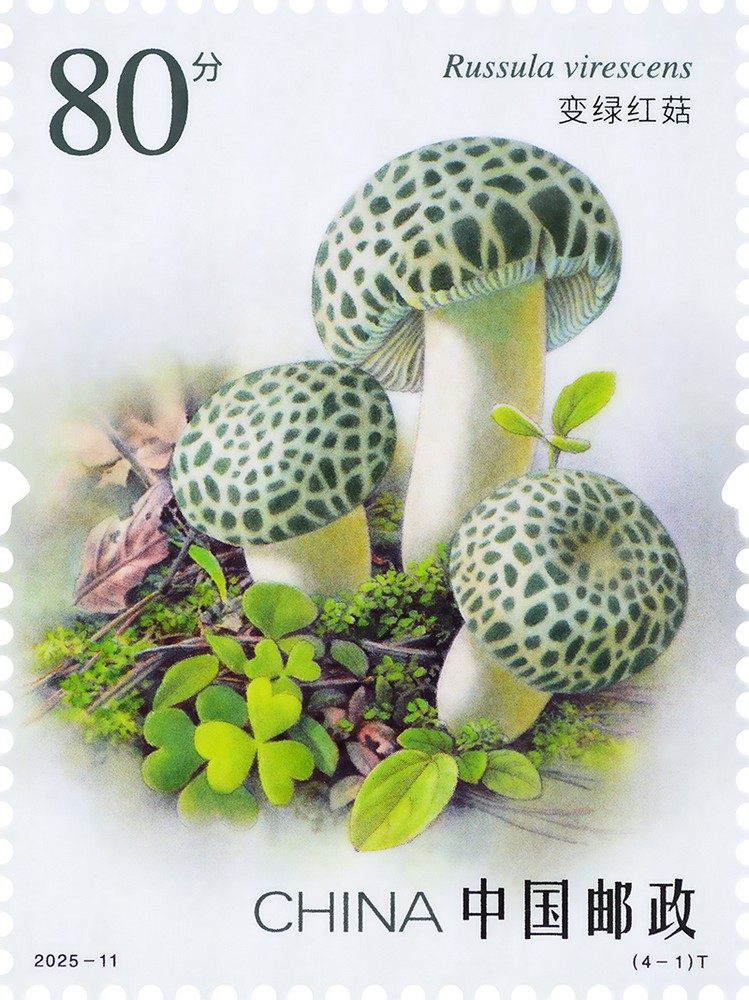 第一枚“变绿红菇”,俗称“青头菌”,隶属红菇科。菌盖较硬,呈青绿色,表面有青褐色的鳞片。其分布广泛,鲜美的口感深受人们喜爱。邮票设计突出其青翠欲滴的色泽,并融入森林生态背景,使整体形象兼具自然野趣与美学韵味。