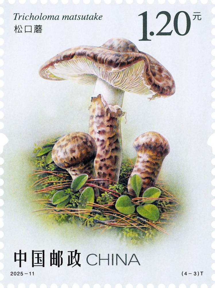 第三枚“松口蘑”,俗称“松茸”,隶属口蘑科,是世界公认的珍稀名贵天然食用菌,同时也是我国二级濒危保护物种。松口蘑历来被誉为食用菌中的瑰宝,享有“蘑菇之王”的美誉,珍贵无比。邮票采用细致的笔法刻画松口蘑菌盖表面的细微纹理及菌柄的粗壮形态,同时背景加入松林元素,以柔和的光影表现其生长环境,增强画面的自然氛围。