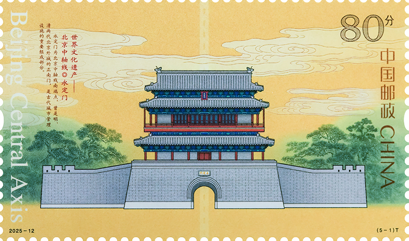 中国邮政定于2025年7月27日发行《世界文化遗产——北京中轴线》特种邮票1套5枚。邮票图案名称为:永定门、正阳门、天安门、故宫·景山、钟鼓楼。全套邮票面值5.50元。邮票计划发行数量为套票570万套,版式二69.3万版。