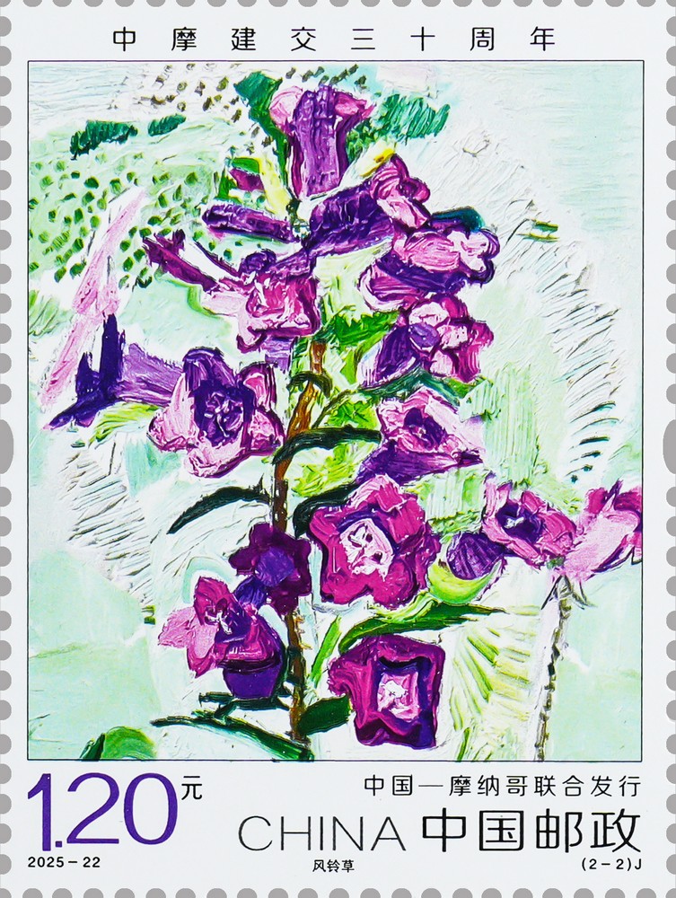 中国邮政定于2025年10月15日发行《中摩建交三十周年》纪念邮票1套2枚,邮票图案名称为:春兰、风铃草。全套邮票面值2.40元,计划发行数量为450万套。